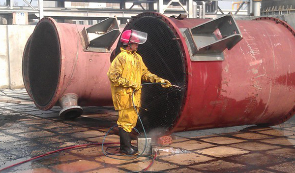 利用高壓流水對設備進行清洗。需要高壓清洗設備。